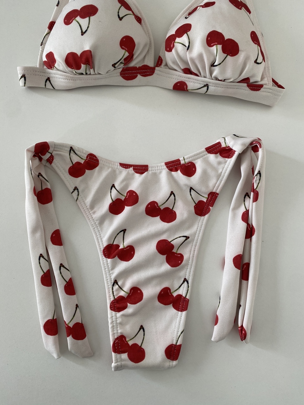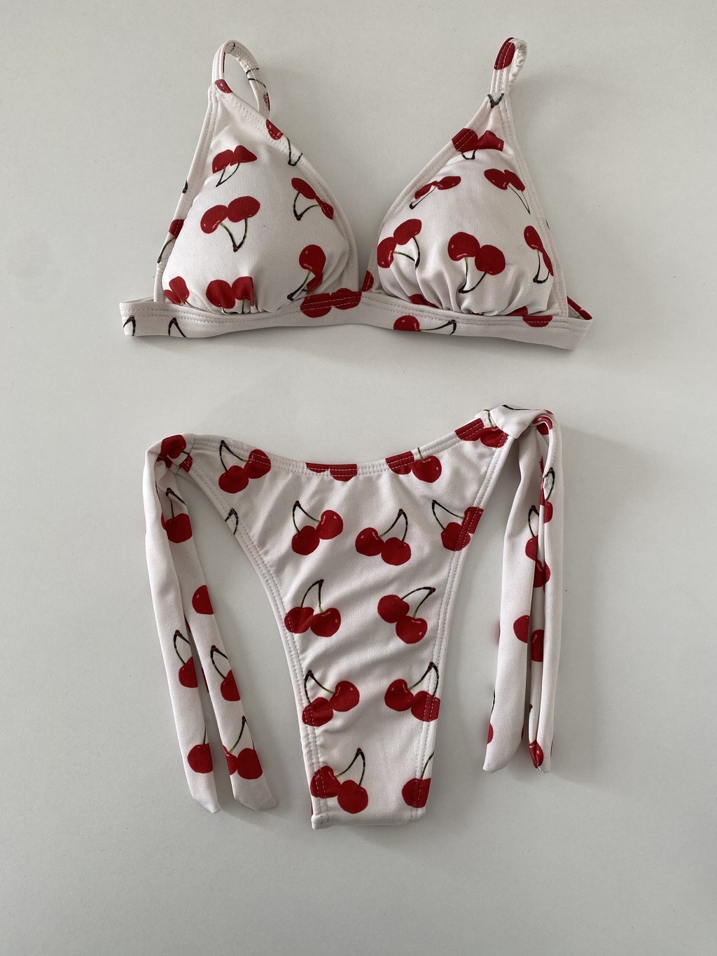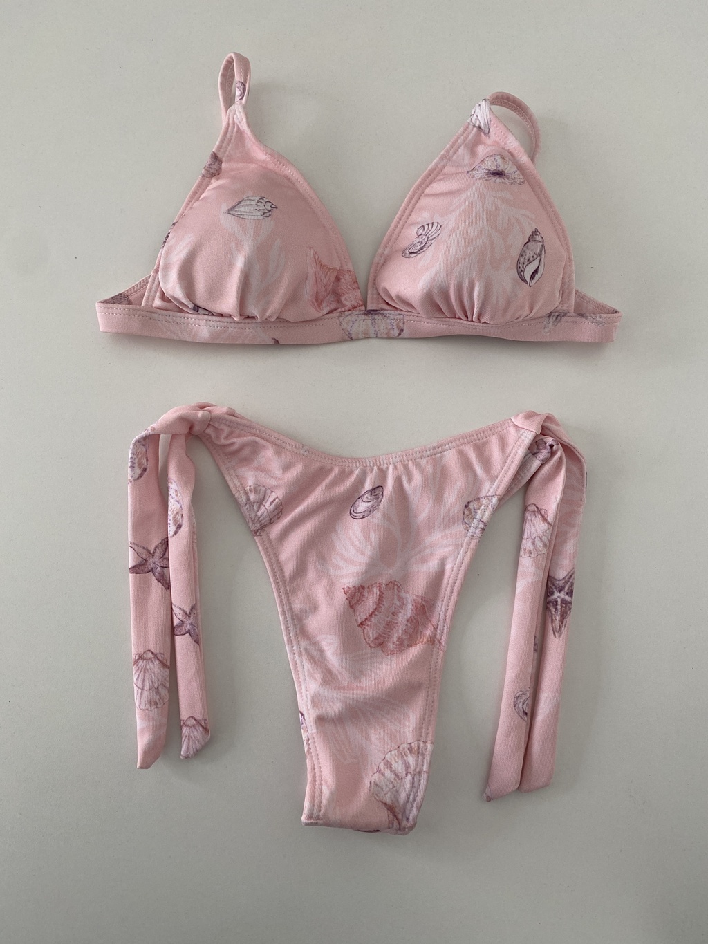 Bikini parte de triángulo con frunce y bombacha en corte V con tiras para atar. Un set de dos piezas confeccionado en microfibra